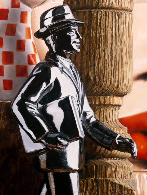 As usual, selecting the other objects in the narrative was a slow process of placing, looking, photographing and adjusting, repeated over and over until the composition felt right. What surprised me the most with this still life was how the other objects don't seem to overly complicate the painting even though some of them have human traits and are attention-getting on their own. I think it all works visually because those other "characters" are gazing out at the viewer while Frank is looking away from them to a point off of the canvas. It's as if his plans don't really include the rest of the scene, making it more like a backdrop. The little red cocktail monkeys are all over the place, doing their darnedest to distract him but Frank looks determined to continue on his course.